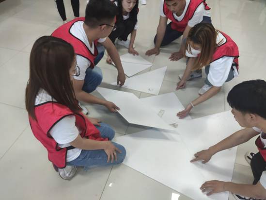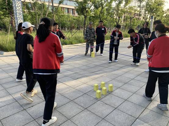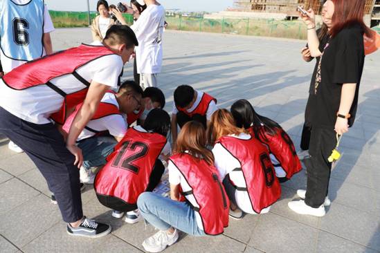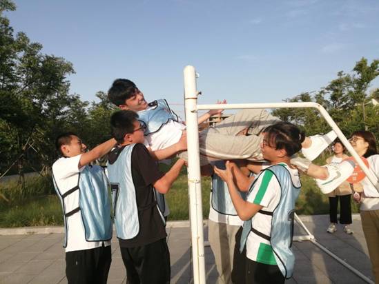 在团队合作闯关活动中,各二级学院派出1位老师和7名同学组成参赛队伍进行比赛。