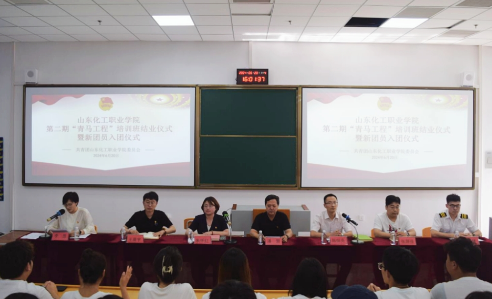 山东化工职业学院第二期“青马工程”培训班结业仪式暨新发展团员入团仪式 2024年6月20日下午,山东化工职业学院第二期“青马工程”培训班结业仪式暨新团员入团仪式在主校区阶梯11室举办。学校党委副书记潘慧、学生工作处副处长陈恒亮、团委书记朱怀红出席本次会议。二级学院团总支书记、第二期青马班182名学员及新发展团员代表参加会议。大会由青马工程培训班班主任李昂老师主持。