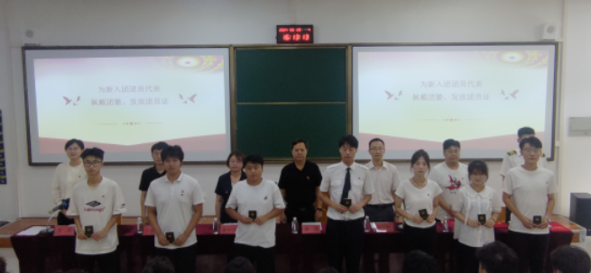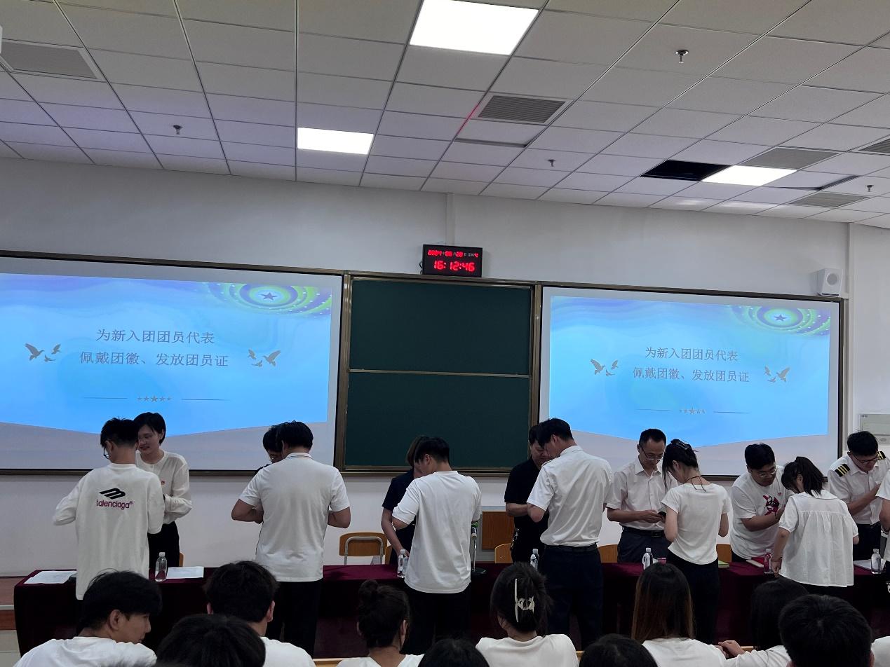 主席台领导、老师为新发展团团员代表佩戴团徽、发放团员证;