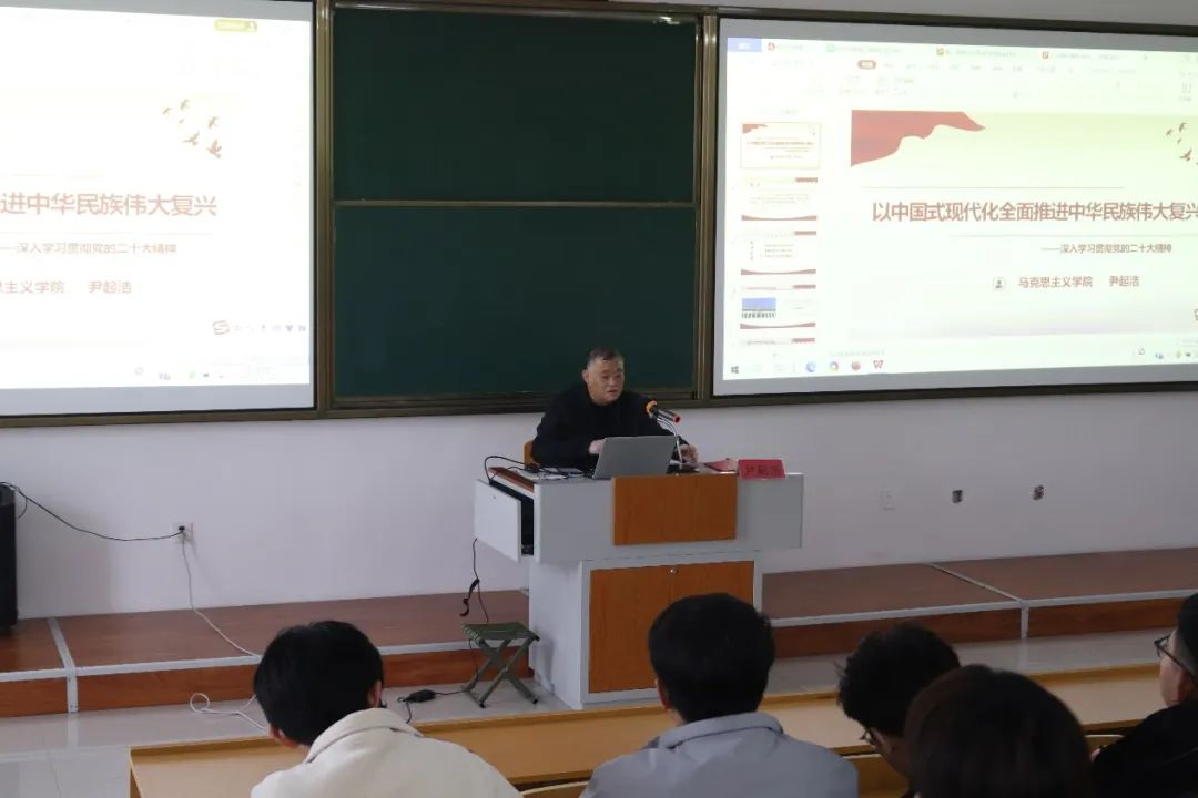 开班仪式结束后,马克思主义学院尹起浩老师以《以中国式现代化全面推进中华民族伟大复兴》为题为参训学员做首场辅导讲座。他从“中国式现代化的科学内涵”、“中国式现代化的核心要义”、“中国式现代化的实践要求”三个方面出发,为青马学员们阐明了“从现在起,中国共产党的中心任务就是团结带领全国各族人民全面建成社会主义现代化强国、实现第二个百年奋斗目标,以中国式现代化全面推进中华民族伟大复兴“,青年学子要强化责任担当,以强国有我、使命在肩的行动自觉,用脚步丈量祖国大地,争做有理想、敢担当、能吃苦、肯奋斗的新时代好青年。