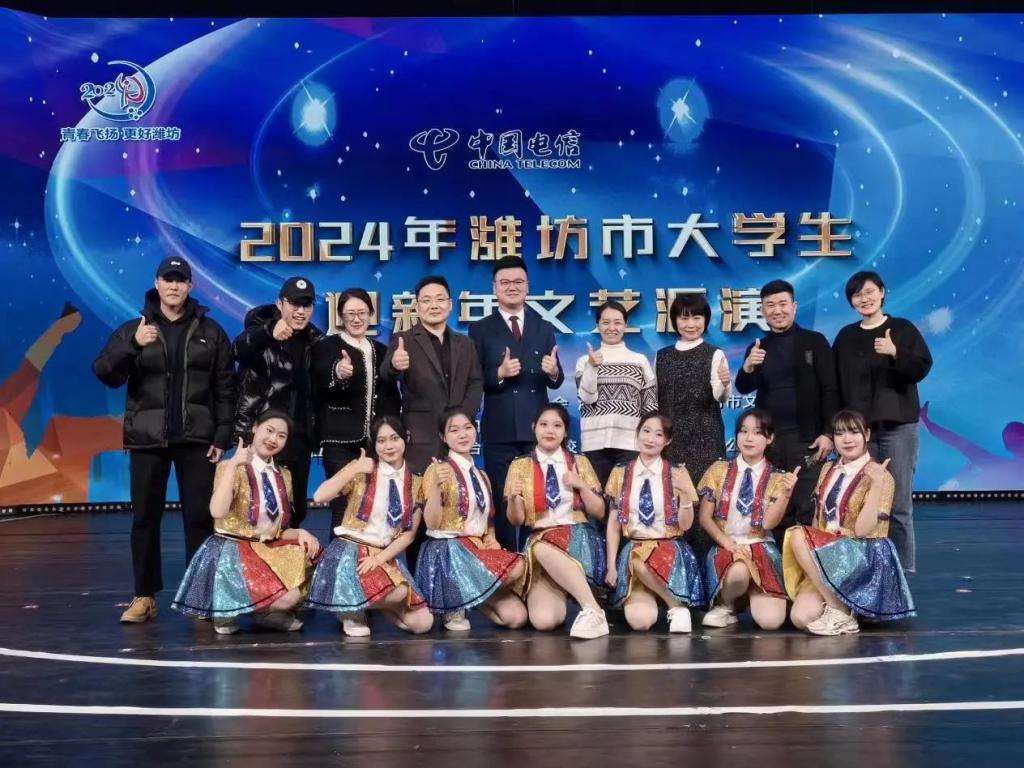 为进一步提高驻潍高校学生的艺术水平,增进各高校之间的沟通交流,展示驻潍高校大学生积极向上的精神风貌。2023年12月27日晚,中共潍坊市委教育工作委员会主办、驻潍22所高校共同参与“迎新年,再出发”,2024年潍坊市大学生迎新年的文艺汇演,此次活动取得圆满成功,广受社会各界赞誉。由我校选送的节目《燃爆青春》收到观众好评。