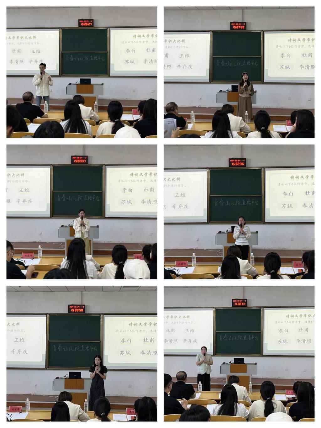 本次诗词大会分为教师组和学生组,共有1个教师组,6个学生组参赛。比赛包括:自我介绍、飞花令和诗词文学常识比拼三个环节。每个环节既是对选手诗词文化素养的考查,又是对选手个人综合素质的考查。
