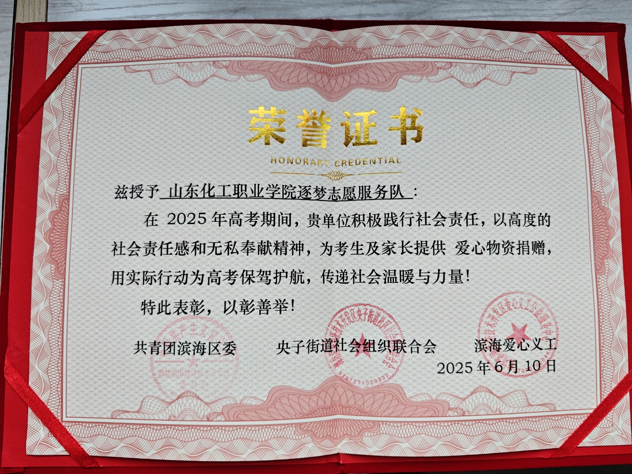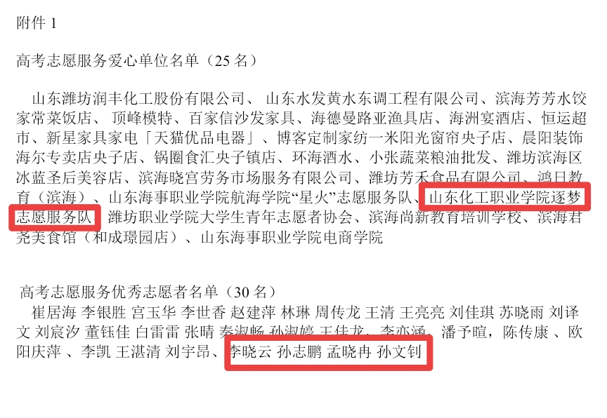 近日,共青团滨海区委、央子街道社会组织联合会、滨海爱心义工公益服务中心印发了《关于表彰高考期间爱心单位及优先职业者的决定》,对在高考志愿服务期间表现突出的25家爱心单位和30名优秀志愿者予以表彰。山东化工职业学院逐梦志愿团队获“高考志愿服务爱心单位”称号,李晓云等4名同学获得“高考志愿服务优秀志愿”称号。