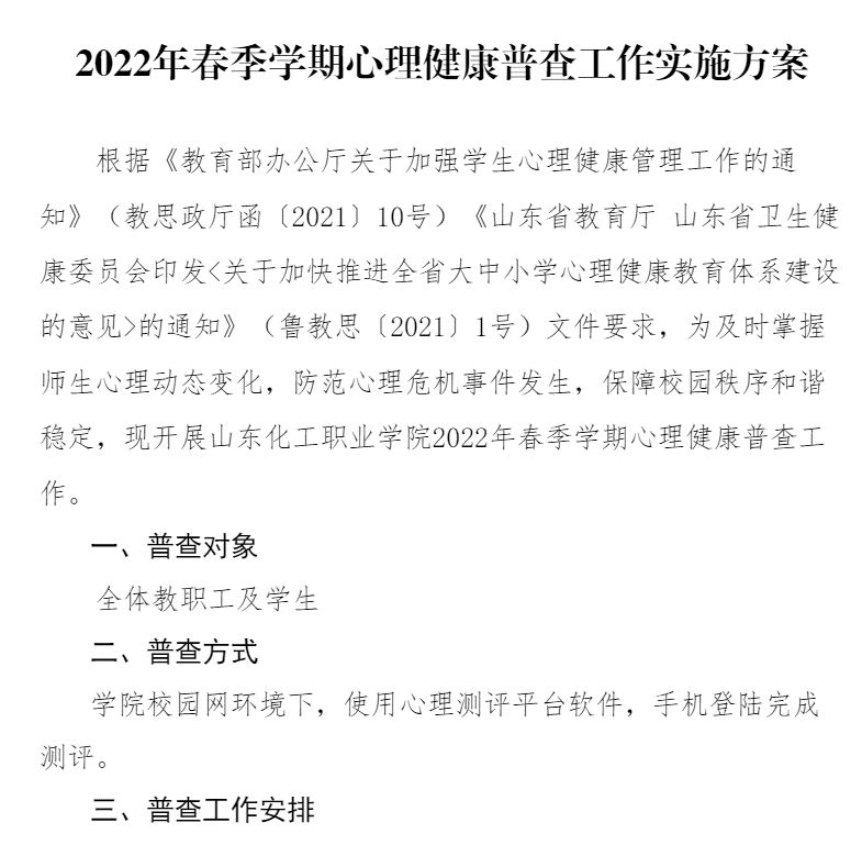 春季新学期开始,根据《教育部办公厅关于加强学生心理健康管理工作的通知》(教思政厅函〔2021〕10号)《山东省教育厅 山东省卫生健康委员会印发<关于加快推进全省大中小学心理健康教育体系建设的意见>的通知》(鲁教思〔2021〕1号)文件要求,为及时掌握师生心理动态变化,防范心理危机事件发生,保障校园秩序和谐稳定,于开学第一周开展山东化工职业学院2022年春季学期全体师生心理健康普查工作。