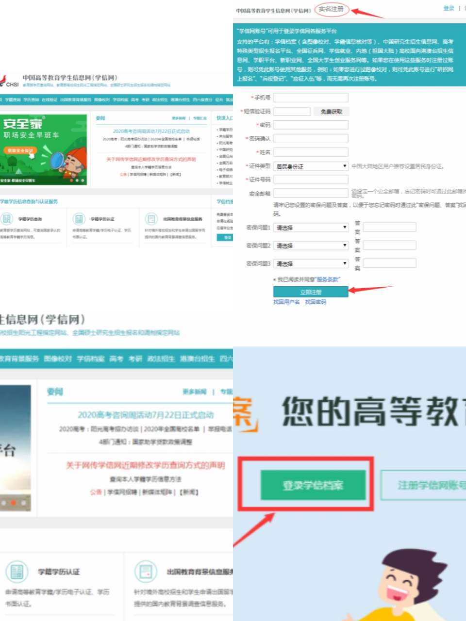 学历照片的核对流程:一、登录中国高等教育学生信息网(学信网)(如果以前没有注册过的,需要先注册账号密码)网址:https://www.chsi.com.cn/(或者百度“学信网”)1.未注册的进入网址点击注册(如下图)