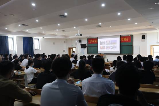 招聘宣讲会上,招聘部主任白朔进行宣讲,介绍了公司的发展历史、企业文化、员工的工资和福利待遇、工作岗位、培养成长体系等情况。