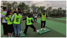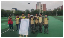 足球场中线处架有画板,画板上贴有只有模糊印记的蒙娜丽莎简笔画像。要求团队成员做好分工,分别在画布上画眉毛、鼻子、眼睛等,队长负责指挥。每个队员在绘画前要带上眼罩,前进四步,旋转两周,然后由队长指挥进行蒙娜丽莎简笔画创作。所有成员完成后,与自己团队所画的简笔画进行合照,每个队员都摆出不同拍照姿势即视为完成。