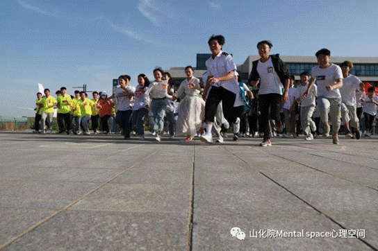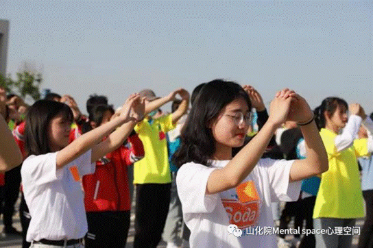 然后,由心理社团4名女生与篮球社4名男生合作,带领全体师生进行热身舞蹈运动。