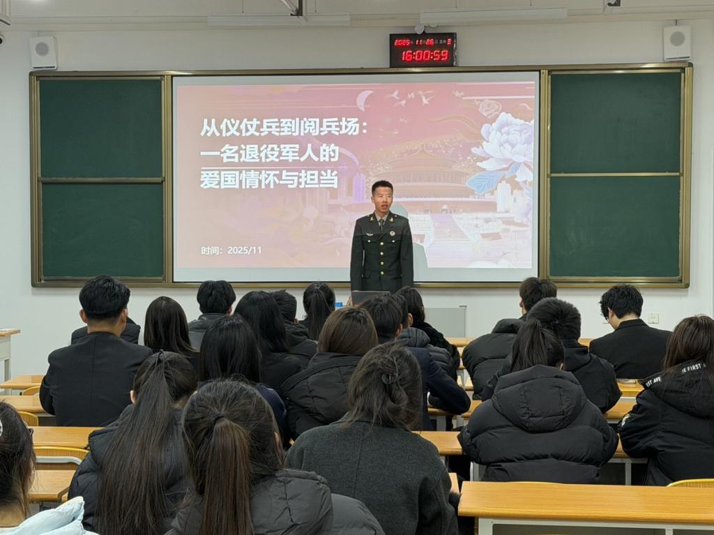 随后,参与过九三阅兵的退伍军人于超以“从仪仗兵到阅兵场:一名退役军人的爱国情怀与担当”为题分享感悟。他结合自身经历,讲述在仪仗队训练与阅兵场执行任务中的难忘瞬间,生动诠释了新时代青年的爱国初心与责任担当,引发学员强烈共鸣。