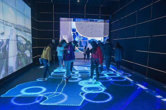第三站来到了以综合交通规划、隔空互动、未来影院及城市综合管廊组成的综合体验馆,这里主要描绘了将在2030年在滨海城市实现便利的交通运输,隔空互动,同学们在这里体验到花开满园、面朝大海的感觉。城市综合管廊主要是以燃气工程、供热工程、海边乐园与幸福城市组成,形象地诠释了祖国未来的宏伟蓝图。