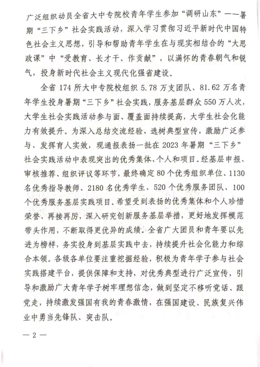 近日,共青团山东省委公布《关于“调研山东”——2023年山东省大中专学生志愿者暑期“三下乡”社会实践活动的通报》,我校荣获多项表彰。学校荣获2023年山东省大学生“三下乡”社会实践“优秀组织单位”,学生梁永辉、杨欣坦、张梦迪获评“优秀学生”,朱怀红、王晓晔获评“优秀指导教师”,山东化工职业学院“初心”志愿服务队获评“优秀服务团队”。