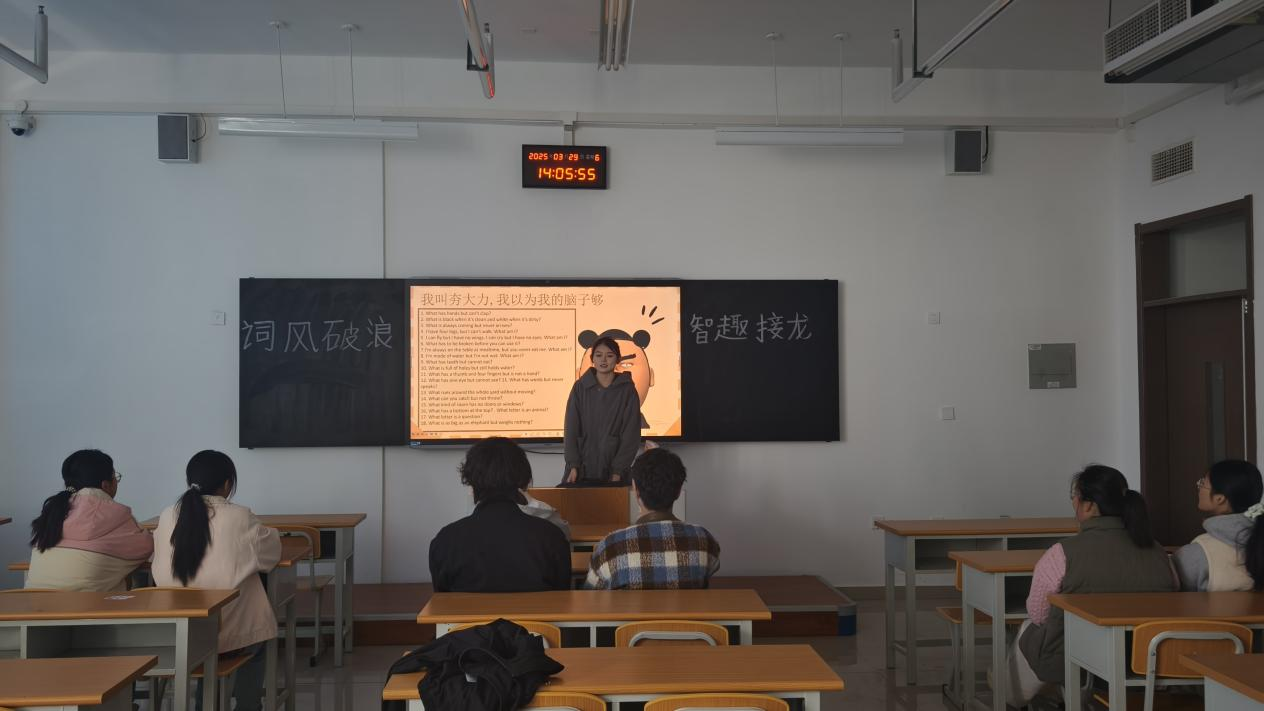 比赛以“词汇接龙” 为核心形式,考验同学们的词汇储备与反应速度。社团成员们踊跃上台,在紧张刺激的氛围中快速思考、准确应答。大家你来我往,不断抛出难度递增的英语单词,充分展现了扎实的英语功底和积极向上的精神风貌。